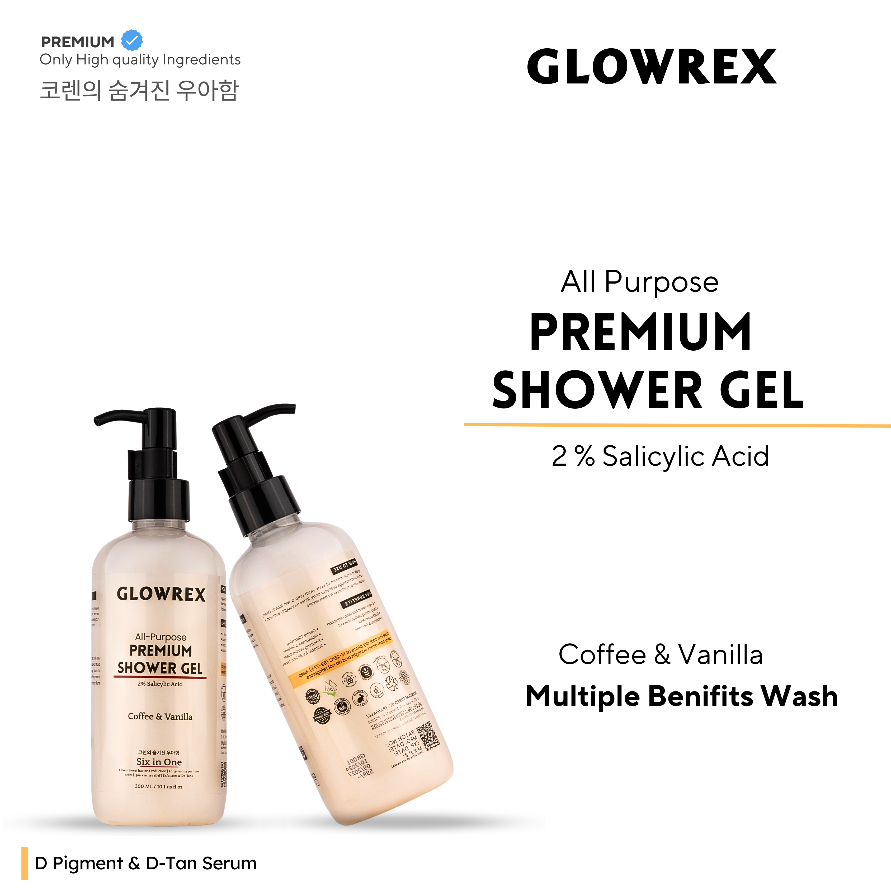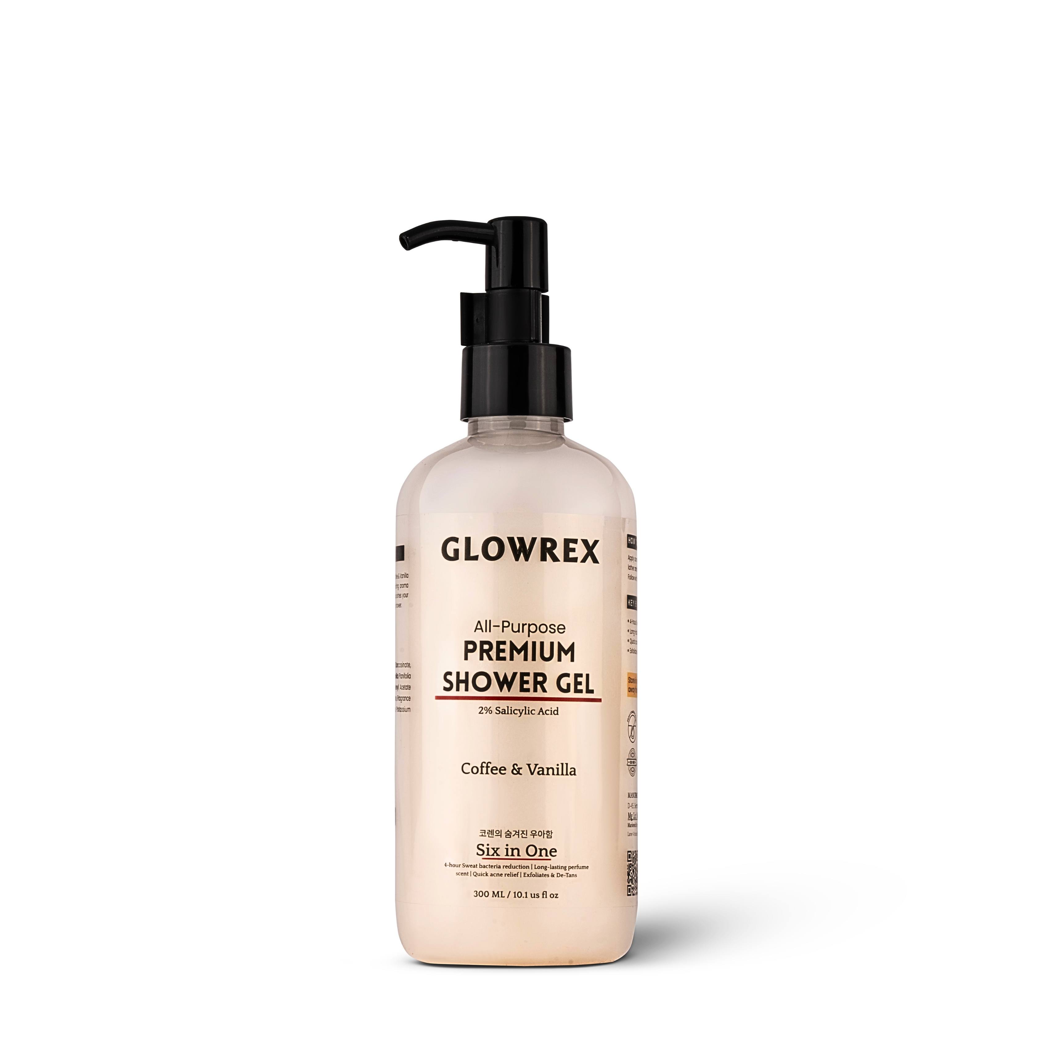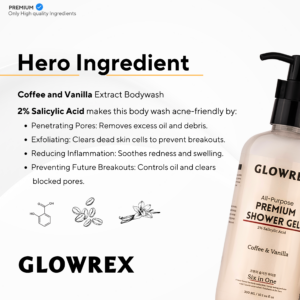 GLOWREX All-Purpose Premium Shower Gel | 2% Salicylic Acid | 4-Hour Sweat & Bacteria Reduction | Long-Lasting Perfume Scent | Quick Acne Relief, Exfoliates & De-Tans with Coffee & Vanilla