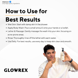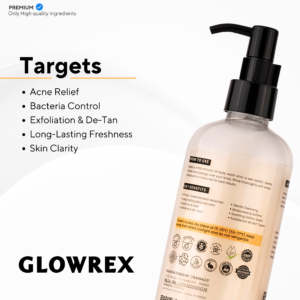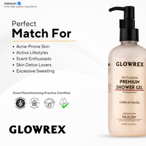 Transform your shower routine with GLOWREX All-Purpose Premium Shower Gel, a luxurious, performance-driven formula designed to cleanse, exfoliate, and rejuvenate your skin. Infused with 2% Salicylic Acid, this shower gel provides quick relief for body acne, deeply cleanses pores, and helps prevent future breakouts. Enriched with coffee and vanilla extracts, it gently exfoliates, reduces tan, and leaves skin soft, smooth, and radiant. Enjoy a long-lasting, refreshing fragrance while staying odor-free and bacteria-protected for up to 4 hours.