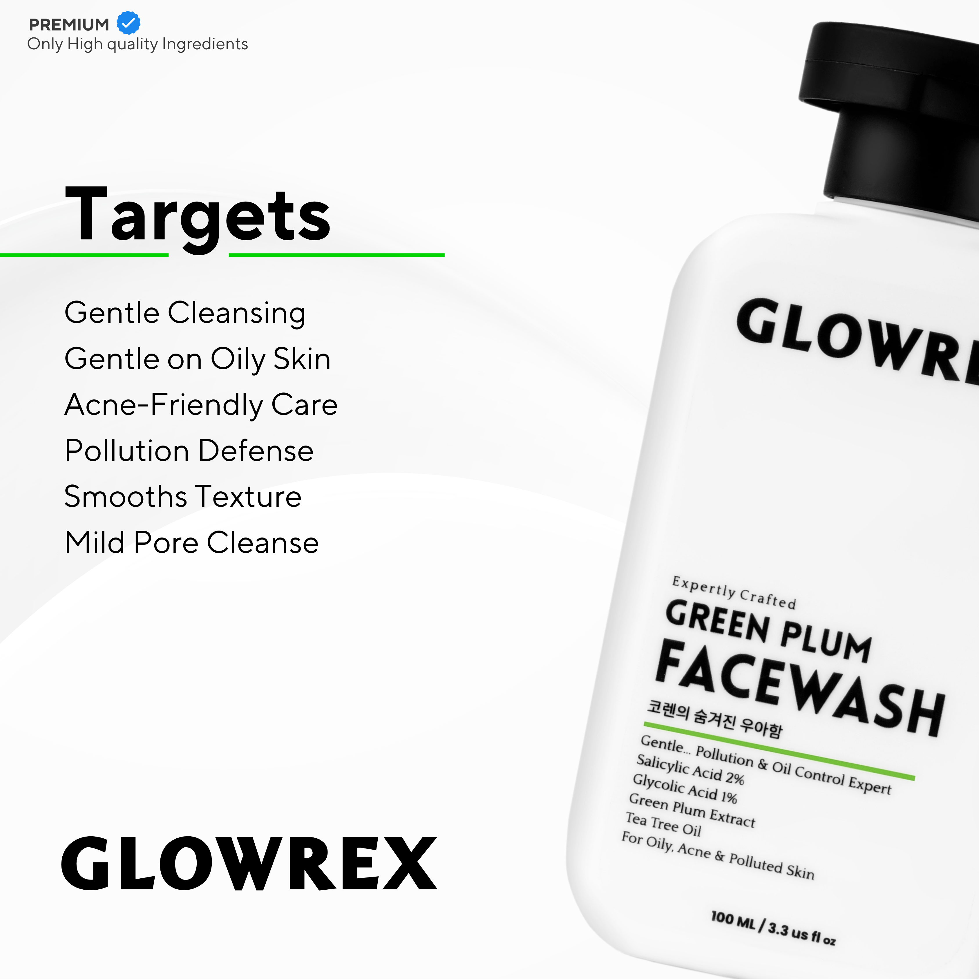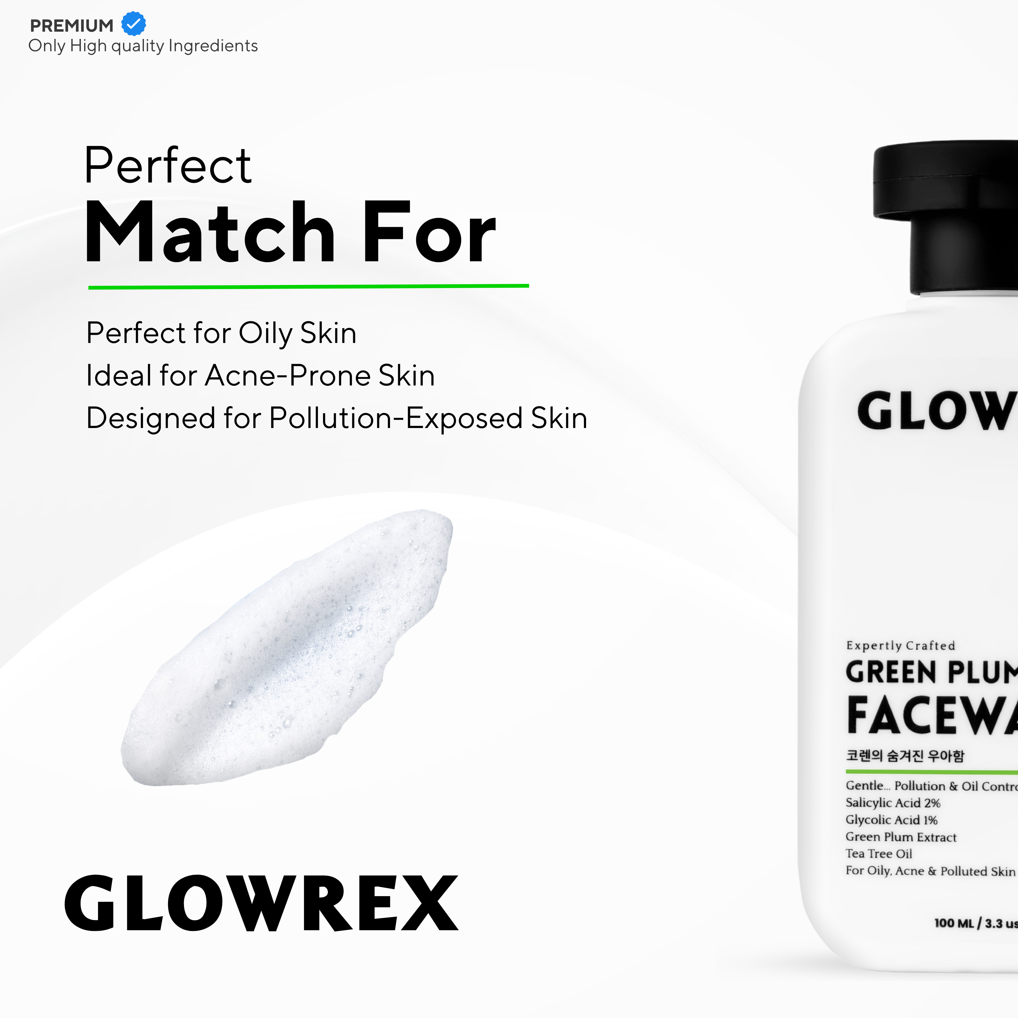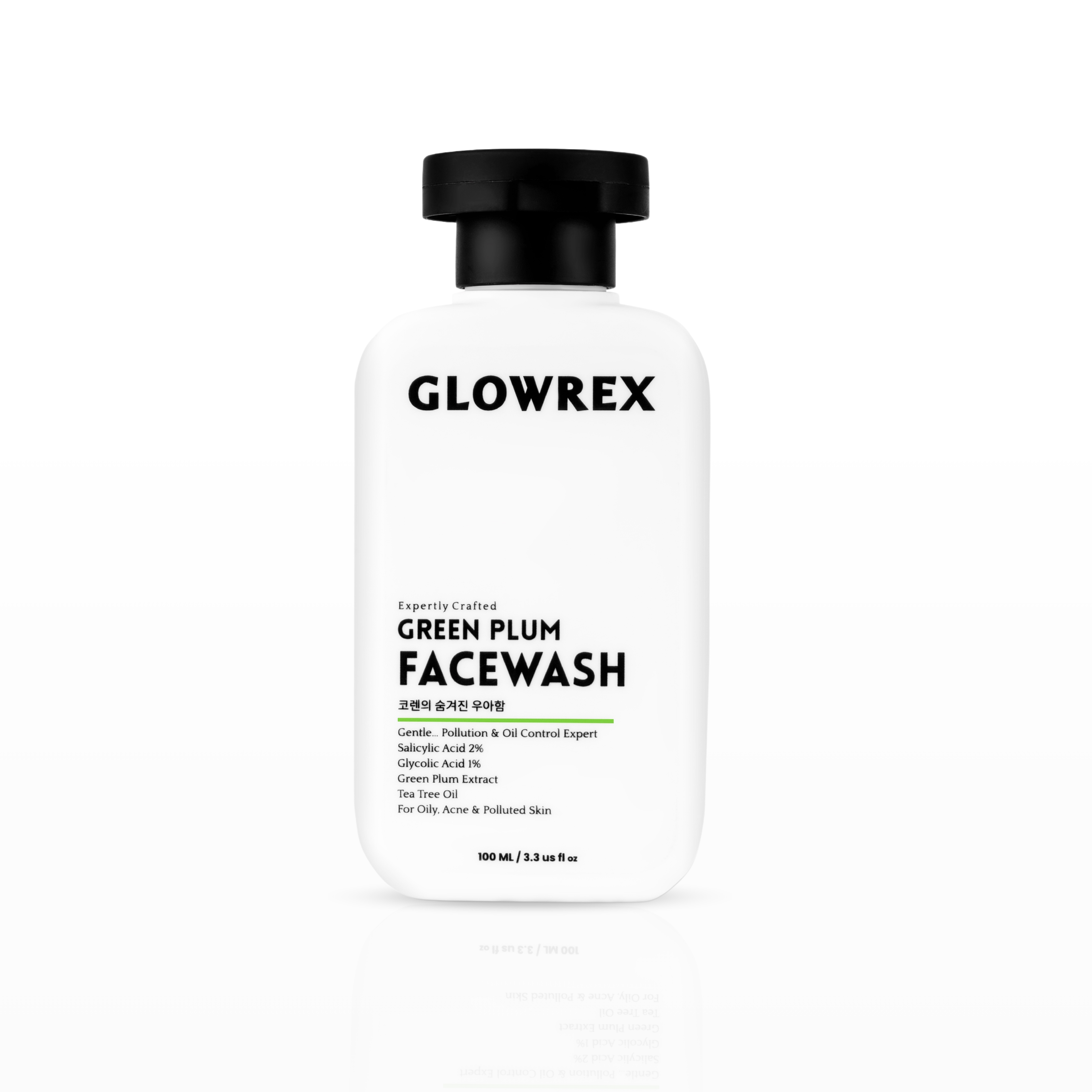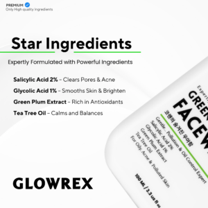 GLOWREX AHA BHA Green Plum Facewash | Gentle Pollution & Oil Control | 2% Salicylic Acid, 1% Glycolic Acid, Green Plum Extract & Tea Tree Oil | For Oily, Acne-Prone & Polluted Skin