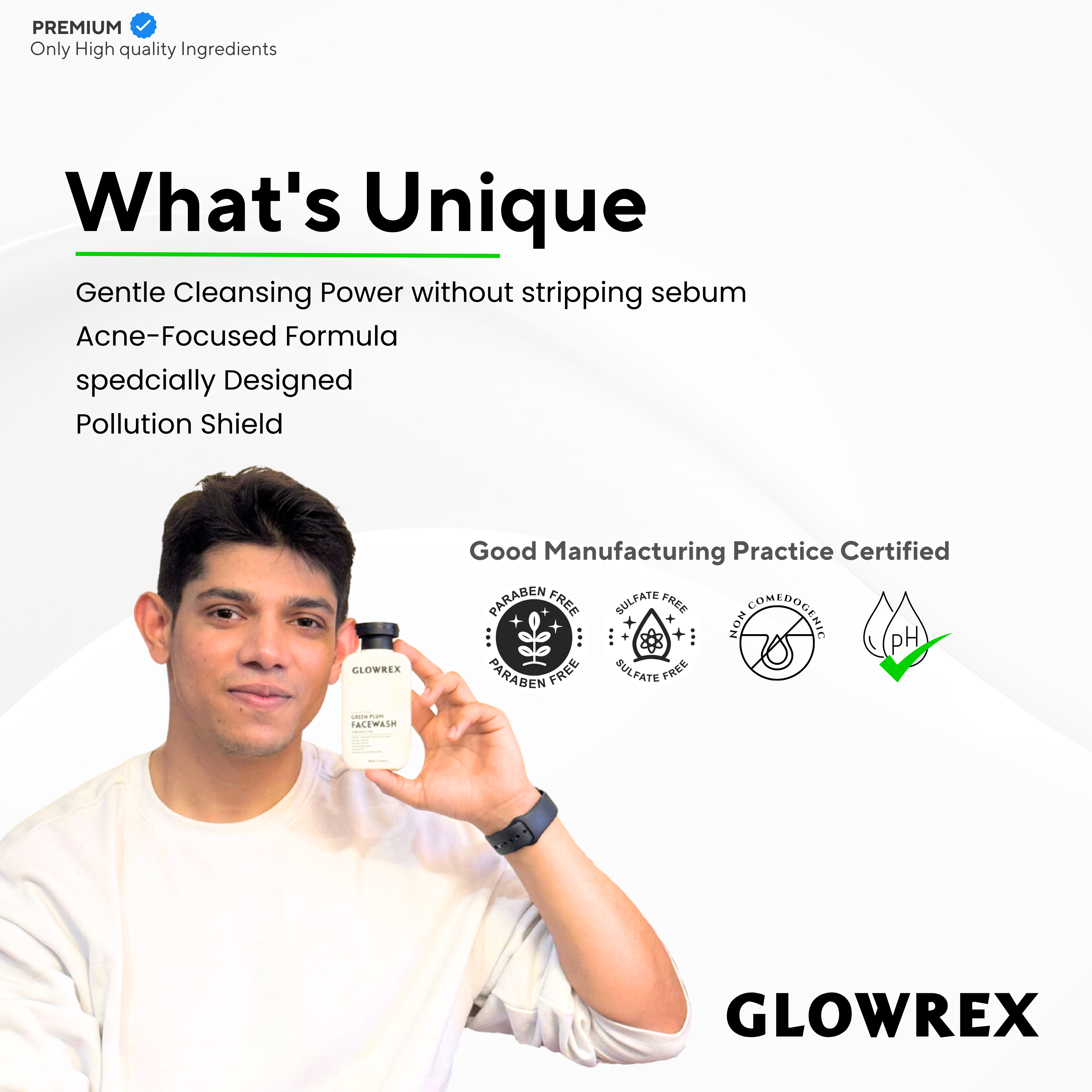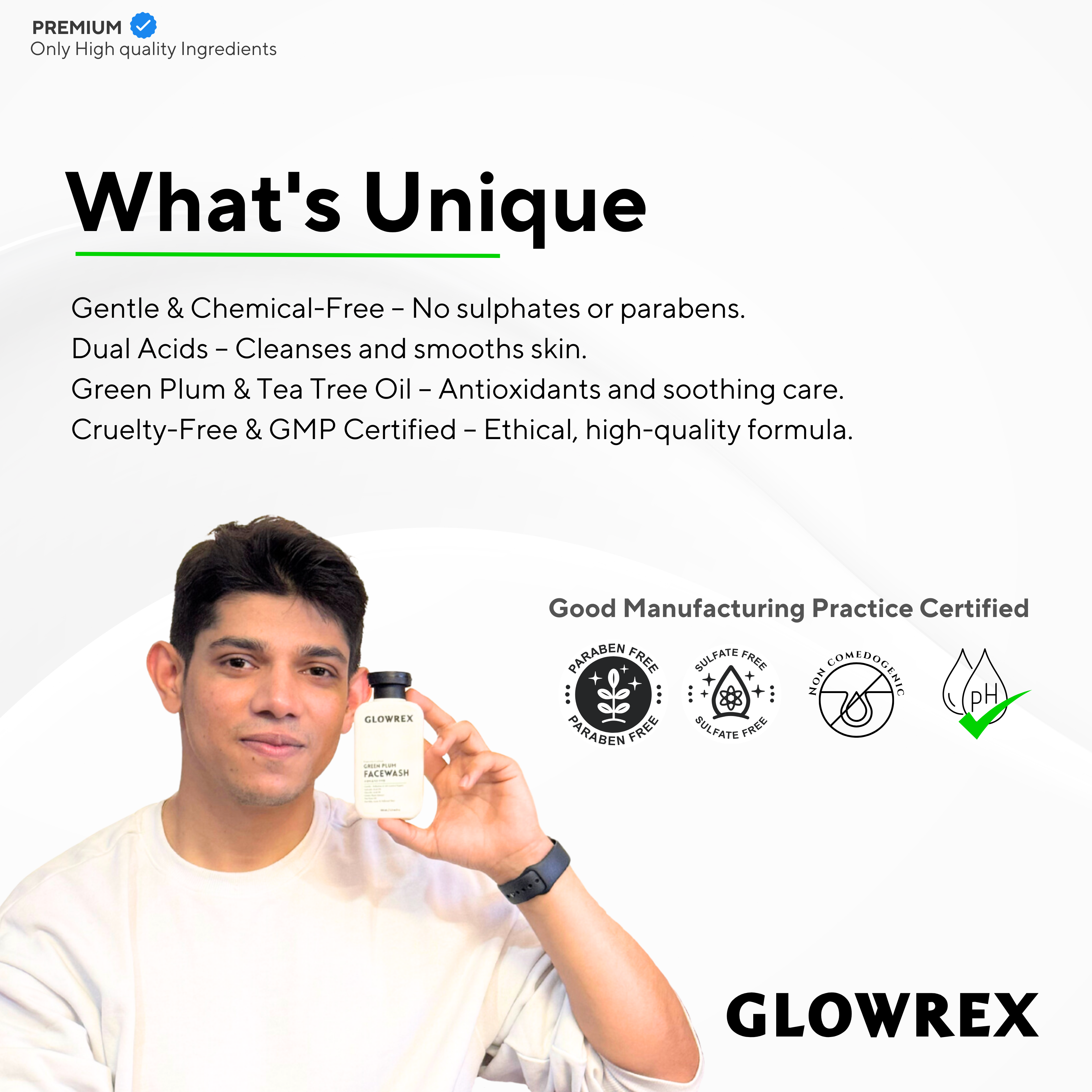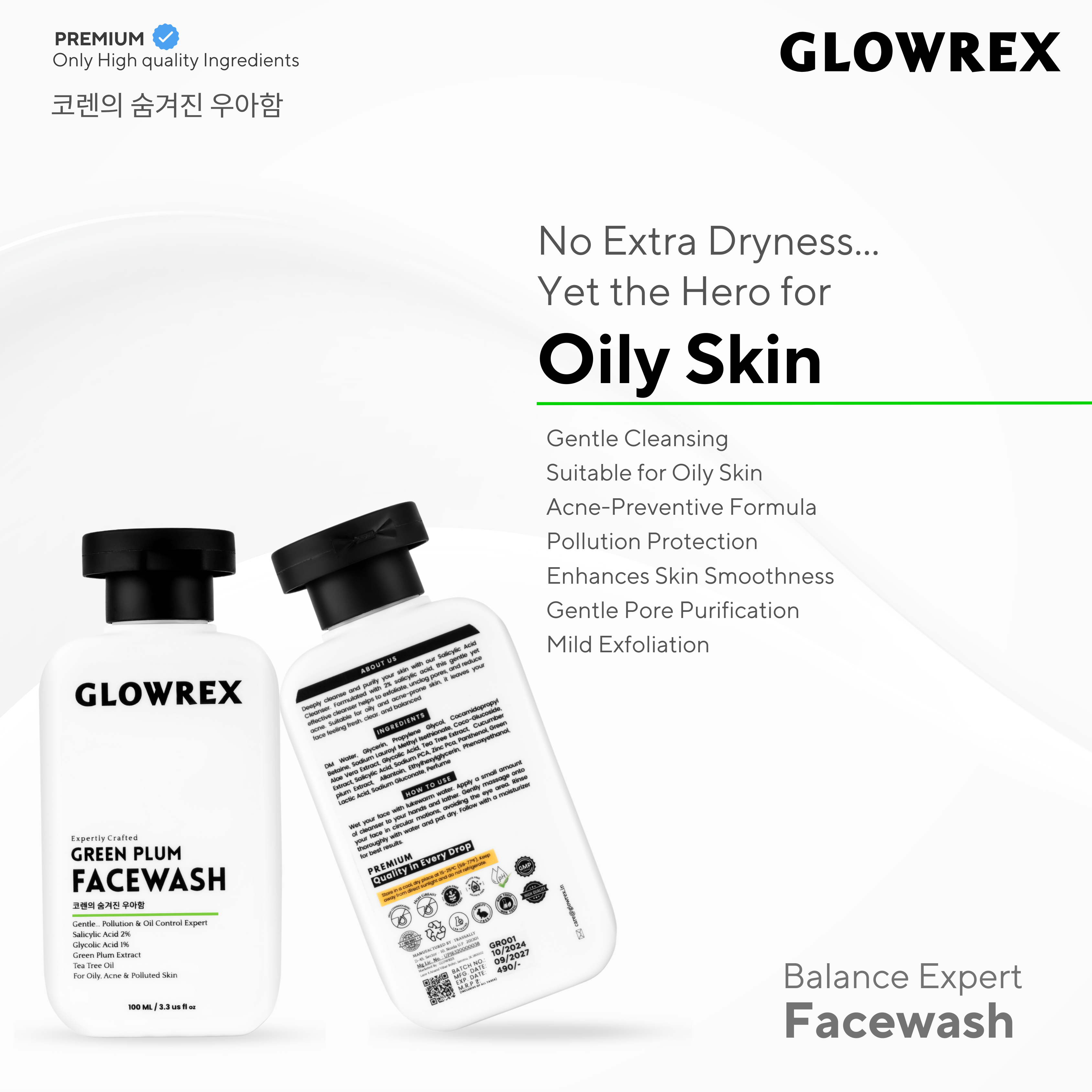 GLOWREX AHA BHA Green Plum Facewash | Gentle Pollution & Oil Control | 2% Salicylic Acid, 1% Glycolic Acid, Green Plum Extract & Tea Tree Oil | For Oily, Acne-Prone & Polluted Skin