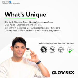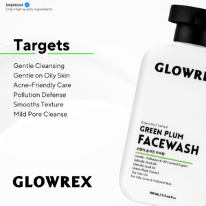 Embrace clearer, healthier-looking skin with the GLOWREX AHA BHA Green Plum Facewash – your daily defense against acne, excess oil, and pollution.